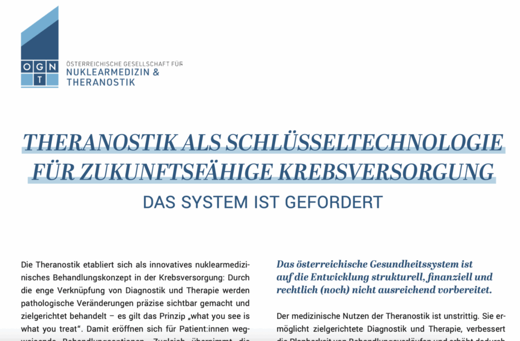 Die Österreichische Gesellschaft für Nuklearmedizin und Theranostik (OGNT) bietet laufend aktuelle Informationen rund um die diagnostischen und therapeutischen Ansätze. Zudem ist die OGNT die von der ÖÄK anerkannte Fachgesellschaft des eigenständigen Sonderfaches "Nuklearmedizin" und daher Ihr Ansprechpartner in allen Fragen rund um dieses Fachgebiet.